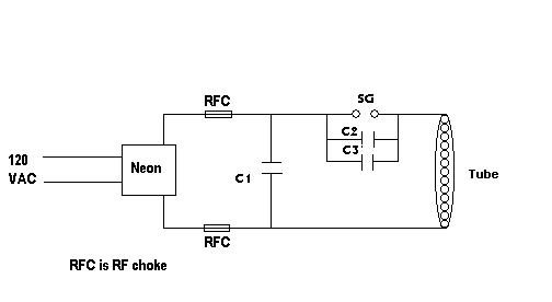 The ASTROD uses homemade capacitors made from wine or champagne bottles. It will operate with a little as one, but using more increases the power output by storing more charge to be output across the gap and then the tube. I currently have three in mine. The diagram below shows how these are connected in the circuit. The Variations article instructs how to make the device using as little as one, two, or more than three capacitors.
