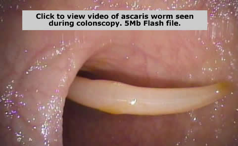 Comments on video of ascaris seen during colonoscopy: On screening colonoscopy, this abnormality was encountered in the cecum. This round worm is Ascaris Lumbricoides, one of the most common human parasites in the world. When ingested, the durable Ascaris eggs hatch in the small intestine releasing larva that migrate through the intestinal wall, and travel both hematogenously and lymphatically to the heart and lungs. Over the next several days, the larva mature in the alveoli, then migrate up the trachea to be swallowed back into the gastrointestinal The majority of Ascaris infections are as in this example asymptomatic. Symptoms are a consequence of either the immunologic hypersensitivity of the host to the worm as in the pulmonary stage referred as Loffler's syndrome or to mechanical obstruction of lumen by the worm. Heavy worm burden can result in intestinal obstruction and migrating worms can cause pancreatitis and/or cholangitis when involving the pancreatobiliary tree. Multiple medical therapies are approved for its treatment including mebendazole. Epidemiologically, infections are most common in areas of lower socio-economic conditions. This man manages a pig farm in China that is used to test pharmaceutical agents. From an endoscopic standpoint it is noteworthy that the worms do not like light and will move away fro the attention it is receiving. In this example, the endoscopist was too slow to snare his prey which succeeded in escaping temporarily into the cooler and darker confines of the small bowel out of reach of the endoscope but not from the soon to be consumed anti-helminthic therapy. |