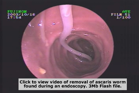 Comments on video of ascaris removal from duodenum: This 34 year old female resident of rural China presented with nausea and vomiting, vague abdominal pain and fever. An upper endoscopy was performed in Beijing. As the endoscope is advanced to the second portion of the duodenum (the duodenum is the start of the small intestine which is attached to the stomach), a live Ascaris was encountered. Ascaris infections occur worldwide, with current estimates suggesting that 1.4 billion people may be infected with this parasite. The roundworm is retrieved using a biliary basket. Once the worm is secured in the basket, both worm and endoscope were removed from the patient. Notice here the length of the organism, about 20cm in total, and the continued movement even after it is removed. |