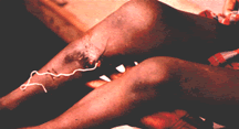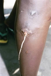 Guinea Worms. First swallowed by a "Cyclops" or water flea, the Guinea worm transforms into a third stage larvae. The Cyclops, ingested by a human being, are consumed by the stomach's juices and the larvae of the Guinea Worm are released. They remain in the stomach for up to three months. After mating, the male dies and the female bores through the body making her way to the extremities, usually the lower leg or foot, but she can go to any part of the body. Once settled, just under the skin, she begins to grow, by eating the flesh of her carrier, into a three to As the worm matures, a painful blister appears on the skin of the carrier. When the person puts the affected part of the body in water, the blister breaks and hundreds of thousands of tiny first stage larvae are released into the water. The adult female worm then comes slowly out of the body of its carrier through the sore made by the broken blister. It usually takes several weeks for the worm to completely exit the body. People, having no choice, drink the infested water, ingest the worm and the entire cycle begins once again. No matter how often people are infected they do not become immune to the Guinea Worm. Both young and old alike are subject to this dreaded parasite. |