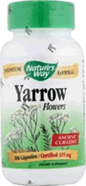 Yarrow flowers - Yarrow has excellent antibacterial, antiinflammatory, and antiallergenic properties, and is a good antiviral, astringent, and antiparasitic to boot. It is often taken for colds and flu, but is just as useful or more so in many chronic disorders. Lowers blood pressure, improves circulation, and stops excessive bleeding, internal or external. Effective for weak digestion with its bitter properties, but its bitterness makes it hard to take as a single tea on a regular basis. One of the single best herbs to take to fight many infectious disorders. Too much at one time can cause cramps, so decrease dose if this occurs, or take with ginger to mitigate this effect. Usual dose is 1/4 to 1/2 tsp or 1 to 2 capsules taken two or three times per day. Start with the smaller amount (1 capsule or 1/4 tsp).